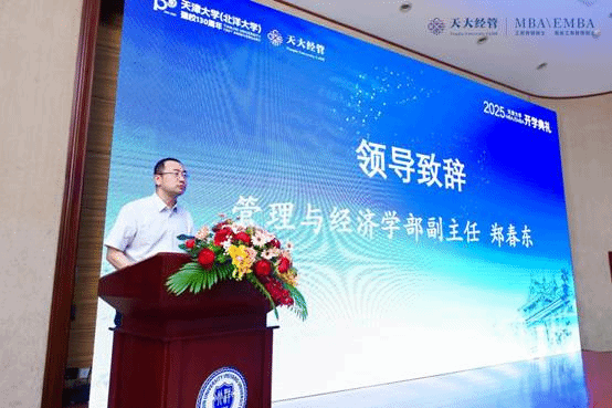 典礼在庄严的国歌声中拉开帷幕。天津大学管理与经济学部副主任郑春东致辞,他代表学部对全体新生致以热烈欢迎,回顾了天大百卅办学历史并介绍学部的发展现状。郑春东寄语2025级新生,希望大家成为“实事求是”校训的传承者,严谨治学、追求卓越校风的弘扬者,爱国奉献、担当责任精神的践行者。郑春东强调,天津大学不仅是知识的殿堂,更是精神的沃土,期待每一位新生在天津大学的学习生活中,学有所成、学有所获、学有所用,开启一段值得铭记的人生新篇章。
