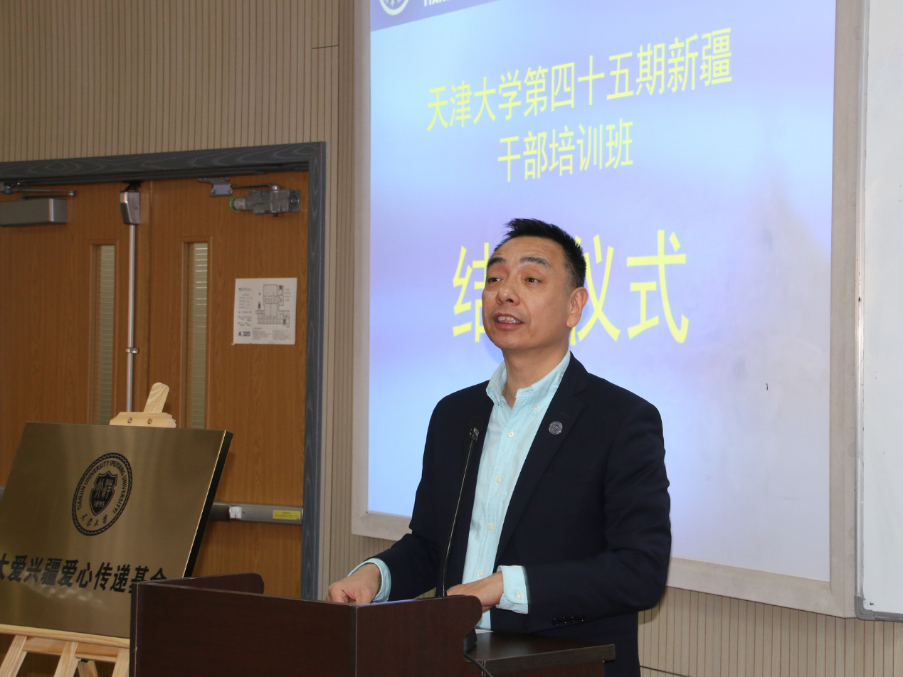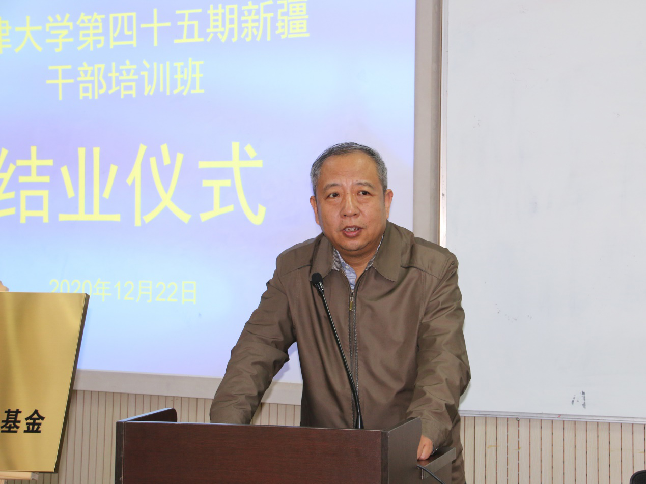 张力新代表学校祝贺第四十五期学员圆满完成了学习任务,表示在疫情防控的时期,本期新疆班如期开班,得到了新疆党委组织部、工信厅以及天津大学各级领导的大力支持,是各方工作人员辛勤工作的结果。在新疆班开办30年之际,举办结业仪式,仪式感不同寻常,有着特殊纪念意义。同时,他向学员提出三点建议:一是要坚持实事求是,一切从实际出发,要举一反三、灵活运用,要敢于解放思想,开拓创新。二是始终秉承天津大学“兴学强国”的使命、“实事求是”的校训、“严谨治学”的校风、“爱国奉献”的传统和“矢志创新”的追求,希望大家的言行能够充分展现天大的品格,并体现在具体工作中。三是要坚定为民情怀。希望大家“不忘初心、牢记使命”,始终坚守党的宗旨,牢记总书记的教导,坚定为民情怀。