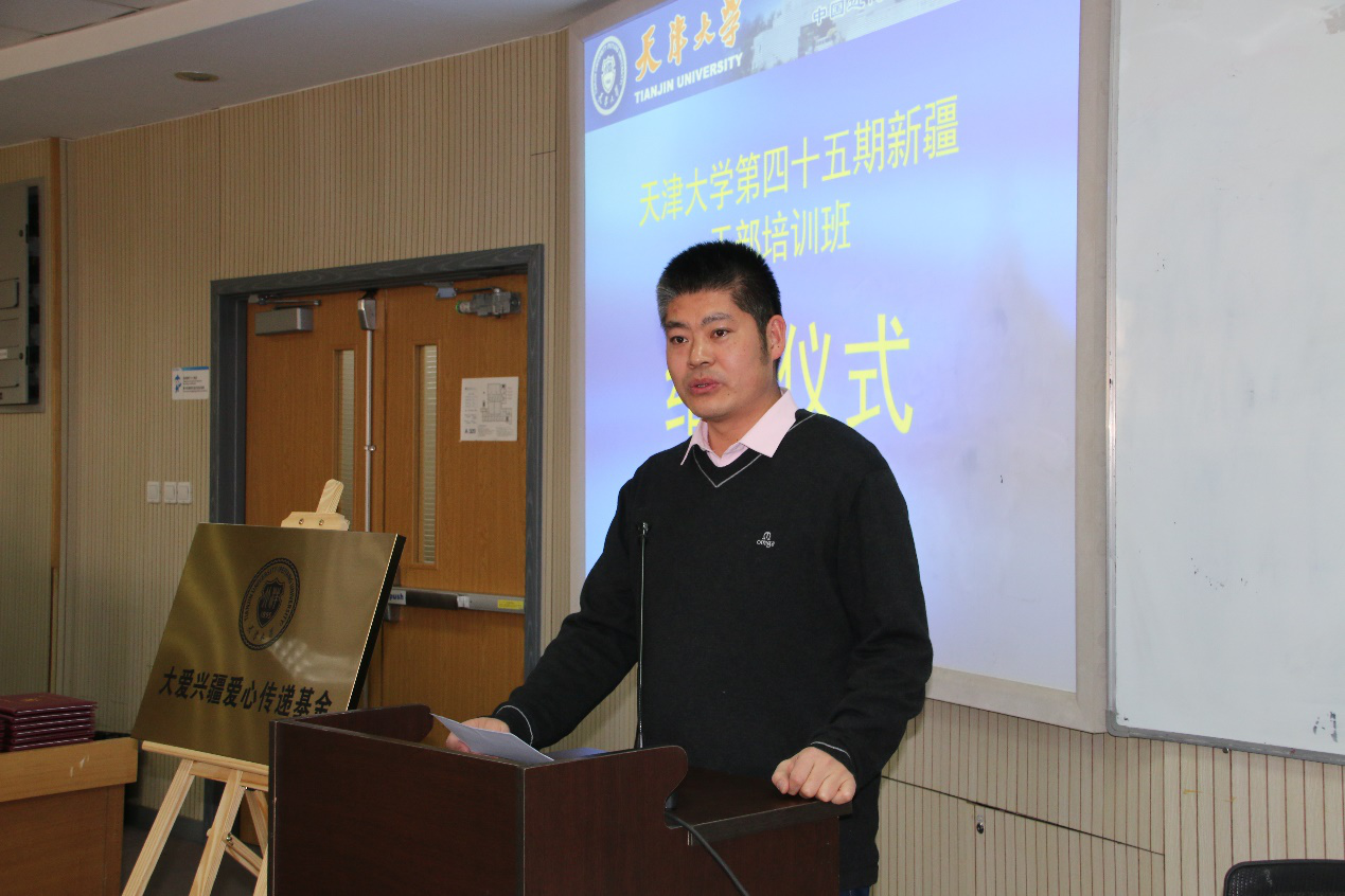 王涛同学代表全体学员作结业发言,表示通过为期两个月的培训,大家的普遍感受是硕果累累、满载而归。一是汲取到了全面的知识,提高了理论水平;二是开拓了视野,增强了使命责任;三是感受并融入到校园浓厚的学习氛围;四是体会到了珍贵的同学友谊;五是平时坚持体育锻炼,做到持之以恒。表示要把在天津大学学到的理论知识和优良学风、作风带到实际工作中去,为推进新疆新阶段的社会发展贡献自己的力量。并对天津大学培训工作的高度重视和周密安排表示感谢。