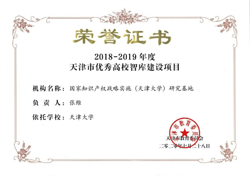 日前,天津市教育委员会对37家天津高校智库在2018-2019年度的建设成效进行了评审,天津大学国家知识产权战略实施研究基地评审结果为优秀,这是本研究基地第三次考核优秀(天津市总计开展了三次评估)。此外,在天津市教委公布的2018-2019年度天津市高校智库优秀决策咨询研究成果的评选结果中,本研究基地2项研究成果获二等奖、2项研究成果获三等奖。