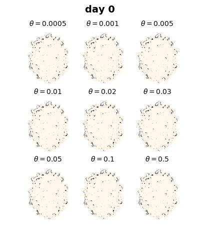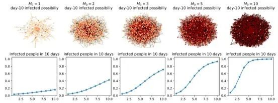 上图是不同接触概率下各节点患病率随天数变化的情况,颜色越深,说明患病概率越大。可以看出,当人群流动意向低于0.005时,病毒难以进行传播;而当人群流动意向大于0.01时,病毒的传播能力是呈加速增长的。