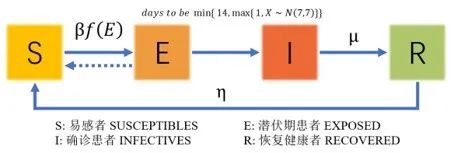 假定人际接触可以描述为一个具有“小世界”和“无标度”特性的复杂网络,网络上的每个节点即一个个体,边表示两个个体之间会发生接触。基于SEIR模型,节点(个体)有四种状态,即易感者(SUSCEPTIBLES)、潜伏期患者(EXPOSED)、确诊患者(INFECTIVES)、恢复健康者(RECOVERED),其转移关系如上图。在本文中,我们认为易感者转移成为潜伏期患者的概率与病毒的感染能力和与邻接节点的互动概率以及邻接节点中存在多少潜伏期患者有关,即病毒传播能力越强、个体接触的潜伏期患者越多,个体本身越容易被感染。而潜伏期患者将在1到14天内转换为确诊患者。