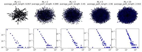 如上图,在控制其他条件不变的情况下,改变网络生成模型的连接参数以生成不同特性的网络,上图从左到右的网络,其节点间平均距离从6.957下降到了2.553(“小世界”特性越来越明显)。