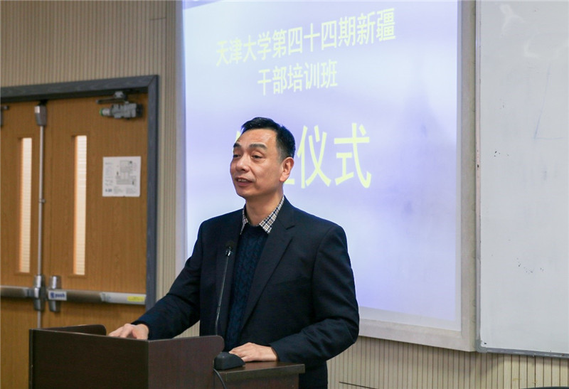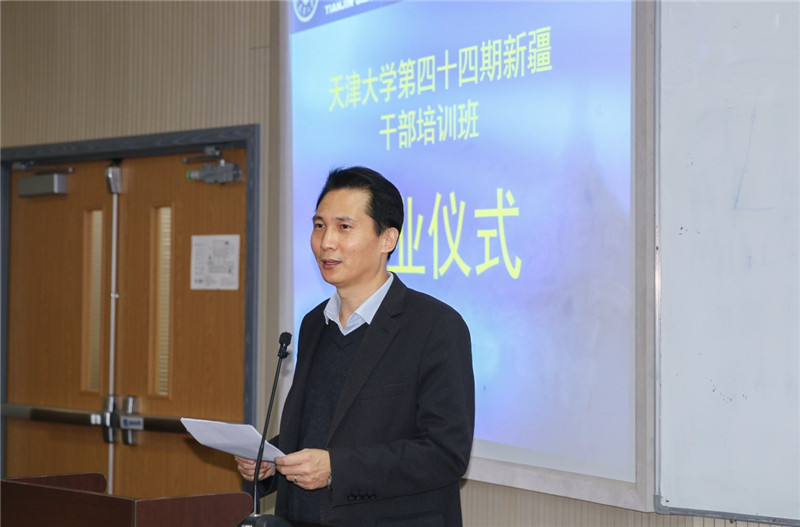 肖松山代表学校祝贺第四十四期学员圆满完成了学习任务,并向学员提出三点建议:一是要坚持实事求是,将课堂上学到的知识、考察参观中的体会及研讨交流的收获灵活运用到工作实际中去;二是坚守天大品格,秉承天津大学“兴学强国”使命、“实事求是”校训、“严谨治学”校风、“爱国奉献”传统、“矢志创新”追求;三是坚定为民情怀,培训期间适逢学校开展“不忘初心、牢记使命”主题教育,作为新疆干部要铭记习近平总书记教导,“在上面要求人,在后面推动人,都不如在前面带动人管用”。