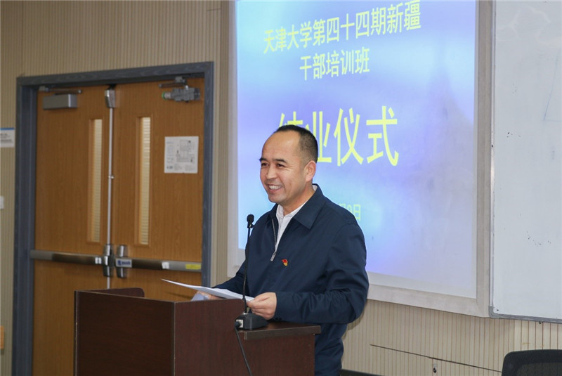 胡瓦提·叶斯木汉同学作为学员代表作结业发言,他对天津大学培训工作的高度重视和周密安排表示感谢,并表示,为期三个月的培训,一是充实了知识,增强了学习的自觉性,二是开拓了视野,增强了加快发展的信心,三是增长了见识,增强了干事创业的激情。走出校园后,他将把在天津大学学到的知识、理论、理念和优良学风、作风带到实际工作中去,为推进新疆社会发展贡献自己的力量。