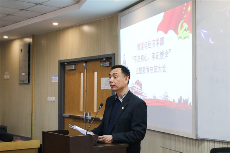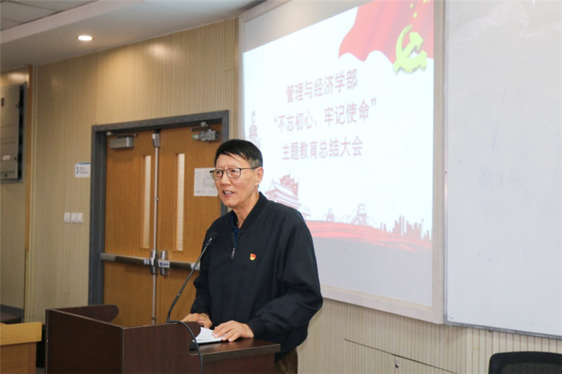 最后,程文生作指导讲话。他首先肯定管理与经济学部主题教育成效,他指出学部各项活动开展到位,学习教育、调查研究、检视问题、整改落实四项举措贯穿始终。此外,学部主题教育在立行立改方面贯彻落实有成效,集中安排研讨会,上下贯通,群策群力,促进学部的整体发展。同时,他也对全体党员同志提出了更高要求,要求师生党员一定要坚持理想信念,全心全意为人民服务,尽心竭力为师生服务,不忘党员责任。