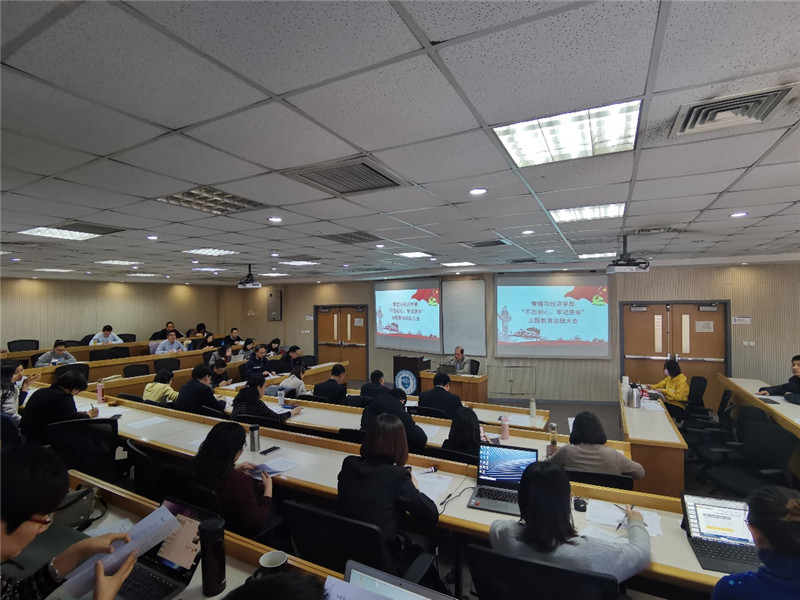 (通讯员:张春馨)2020年1月10日,天津大学管理与经济学部“不忘初心、牢记使命”主题教育总结大会在25楼A区三层A教室举行。与会全体成员共同学习习近平总书记在“不忘初心、牢记使命”主题教育总结大会上的重要讲话,管理与经济学部党委书记马寿峰对主题教育进行全面总结。天津大学“不忘初心、牢记使命”主题教育第五指导组组长程文生出席会议并作指导讲话。管理与经济学部领导班子成员、党委委员、中心组成员、各系所院主任和副主任、教工党支部书记、支部委员以及党员代表参加大会。会议由管理与经济学部主任霍宝锋主持。
