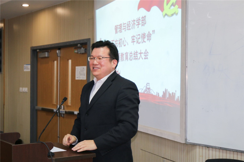 接下来,马寿峰从学习教育、调查研究、检视问题、落实整改四个方面对学部主题教育工作取得的阶段性成果进行全面总结,3个多月的主题教育,学部累计开展中心组集体研讨会7次,各支部学习研讨60余次,组织“理论大讲堂”4期;注重先进典型教育,通过选树“经管榜样”、感悟太雷精神等活动,致敬榜样,学习典型;结合经管特色,开展多层次“结对共建”,加强师生共建共享,注重与企业的联络学习,开展活动25次;扎实做好调查研究,撰写调研报告12篇;全面进行检视问题,推动整改落实,查摆问题25条、制定整改措施49项。同时,马书记对学部持续深入开展主题教育提出了更高要求:一是学习教育要再加温,二是整改落实要再加压,三是制度建设再加强。