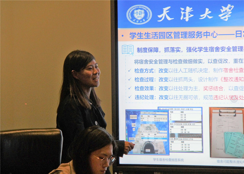 随后,学工部刘玉玮老师以与学生生活息息相关的宿舍管理为切入点,详细介绍宿舍管理服务工作,从检查方式、检查过程、检查效果、违纪处理四方面的改变,强调宿舍安全管理与检查双重结合,以查促改,实现制度保障。作为学生管理与沟通的桥梁和纽带的学工部,学工部坚持全员育人、学生社团建设、管理与教育相结合,不断创新,立足建设与服务。