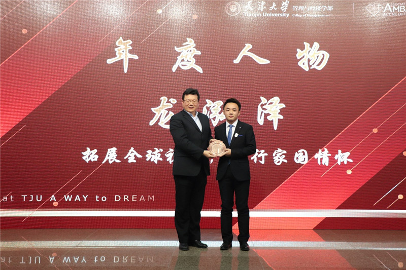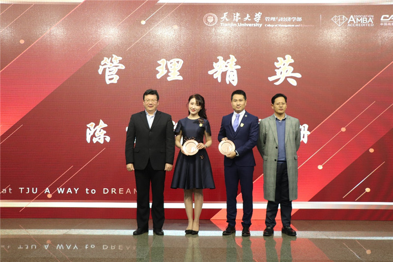陈林、袁婷共同为2019年度“经管榜样”颁发生肖瓷器纪念品。纪念品由陈林校友捐赠,寓意深厚,不仅寄托了他对同学们的美好祝福,还传递了经管人的厚重情谊。陈林作为天津大学EMBA校友会会长,热烈欢迎同学们加入校友会大家庭,正所谓“海阔凭鱼跃,天高任鸟飞”,他寄语同学们在未来的人生舞台上大显身手、大展宏图。