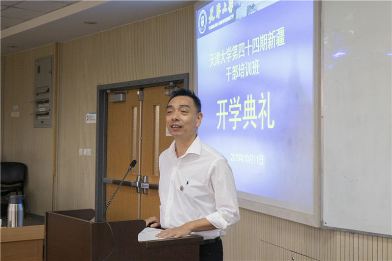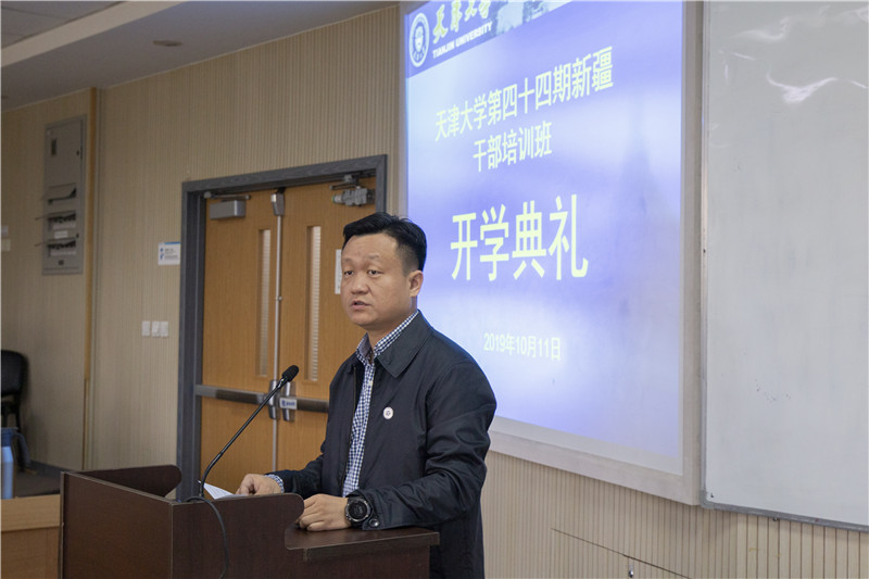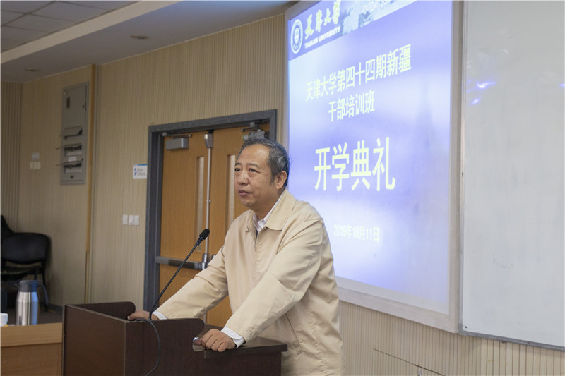 张力新在开班典礼上讲话。他向学员们介绍了天津大学(前身北洋大学)的悠久历史及在中国高等教育史上做出的突出贡献。天津大学坚持兴学强国的使命、实事求是的校训、严谨治学的校风、爱国奉献的传统、矢志创新的追求,他希望学员们继承天大品格,珍惜培训机会,做到学思结合、学有所成、学有所获,努力成为忠诚、干净、担当的高素质干部,为新疆发展、民族团结、社会稳定做出贡献。