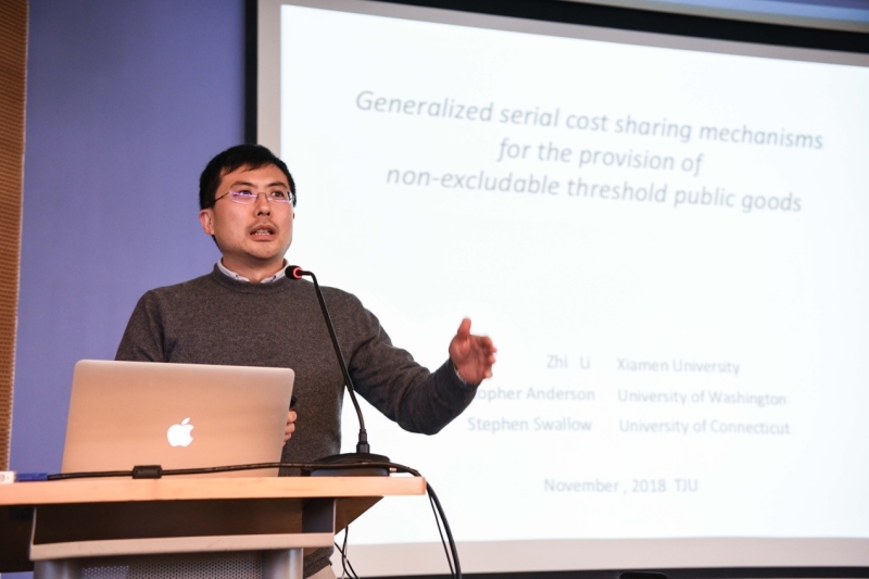 在吉林大学党委常委、总会计师、经济学院杜莉教授主持的“公共物品、能源与环境经济学”专题研讨环节,美国华盛顿大学(西雅图)博士、厦门大学经济学院与王亚南经济研究院李智助理教授围绕《非排他性阈值公共物品提供的广义系列成本分摊机制》这一报告主题,认为均一价格拍卖(UPA)机制与均一价格上限(UPC)机制均满足预算平衡、个体理性与匿名性,但不满足激励相容。针对不完全信息下的非排他性公共物品,李智提出了两种新机制的贝叶斯纳什均衡(BNE),并通过实验室实验将其与文献中流行的按比例分摊(PR)和无返还分摊(NR或PPM)两种机制进行比较。