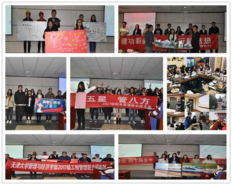 “财五星,管八方”,17级财务管理联合团支部坚持“德智体美劳”全面发展的理念,秉承“管通天下”的决心,用心践行新思想,用行来建功新时代:5次理论学习,财管人紧跟党的步伐,不忘初心;读书分享、主题实践,财管人思想交流,开阔视野,将理论与实践完美结合。17级工程管理专业联合团支部呈现了新工管大桥的落成剪彩仪式,以新颖又富有专业特色的形式向大家展示了一个多月以来支部展开的团日活动:“天大青年之声”系列展板活动,用画笔让褪色的历史重新发光;组织脸谱DIY,在晕开的水墨中将传统与创新糅合;进入幼儿园教小朋友们做风车,转出了工管人的时代风采;大桥落成之际,“巍巍北洋,工管最强”的口号声和庄严郑重的剪彩仪式震撼人心。