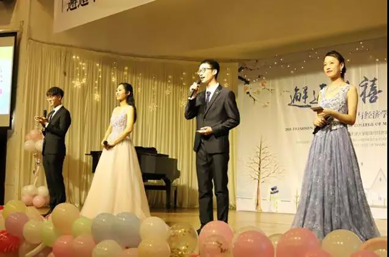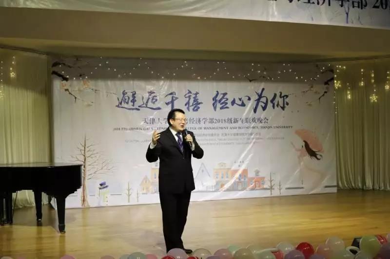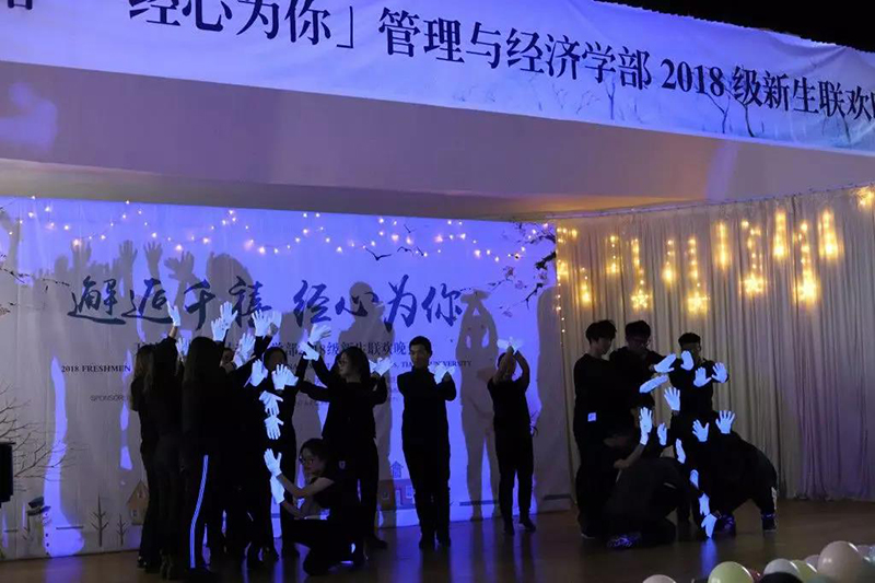 12月21日晚,管理与经济学部2018级新生联欢晚会在大活一层报告厅如期进行。晚会以“邂逅千禧,经心为你”为主题,共分为“余忆童稚”、“灼灼其华”、“禧于来日”三个篇章。节目类型涵盖了歌曲、舞蹈、相声、戏剧等艺术形式,均为自编自导,充分体现了经管学子丰富的创造力和蓬勃的朝气。管理与经济学部主任霍宝锋,副主任毛照昉、袁婷、冯楠,党委副书记李庚,宣怀学院院长助理张琳,学部学工办主任尚洁以及各年级辅导员等共同出席。暖场视频汇集了军骨小班对新生的殷切期望,九班同学带来开场舞《BBOOM BBOOM》就像一束绚烂的烟花点燃天际,晚会随之正式开幕。