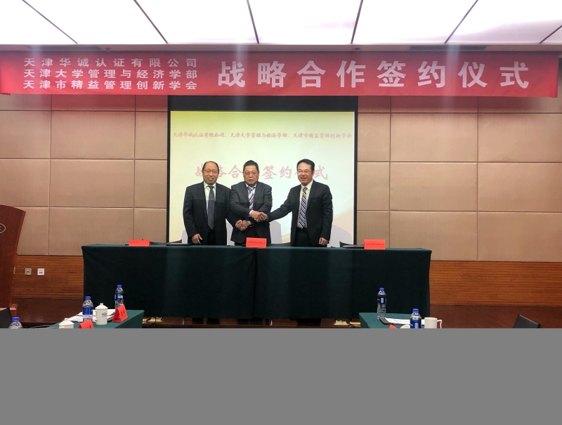 为推进产学研深度融合、促进管理技术创新,充分发挥各方优势资源,本着平等互利、优势互补的原则,天津大学管理与经济学部与天津华诚认证有限公司、天津市精益管理创新学会建立长期战略合作关系。2018年12月28日,三方签约仪式在中国汽车技术研究中心隆重举行。