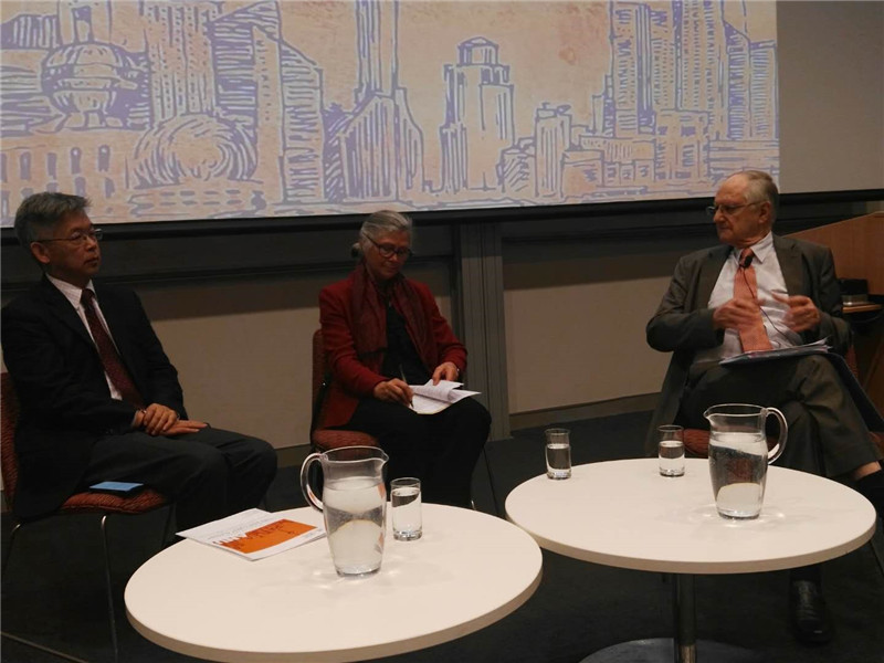 2018年7月19日晚上,举行了Ross Garnaut教授、宋立刚教授和中国社会科学院蔡昉副院长主编的2018年中国经济前沿丛书《回溯40年中国改革和发展:1978-2018》发行仪式。新书收录了来自中美澳三国和国际机构研究中国经济问题的经济学者应邀撰写的31章节。按惯例,发行仪式上会安排一位作者代表发言。今年由央行货币政策委员会委员、国民经济研究所所长樊纲教授围绕中美贸易战做了发言。中国驻澳大利亚大使成竞业出席新书发布会并致辞。