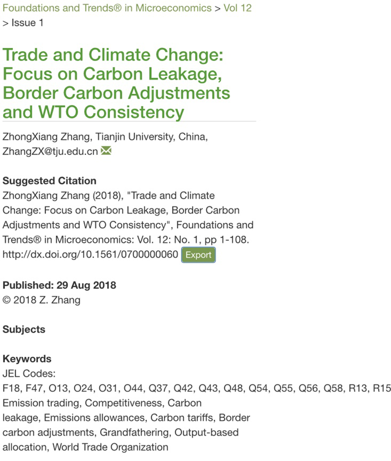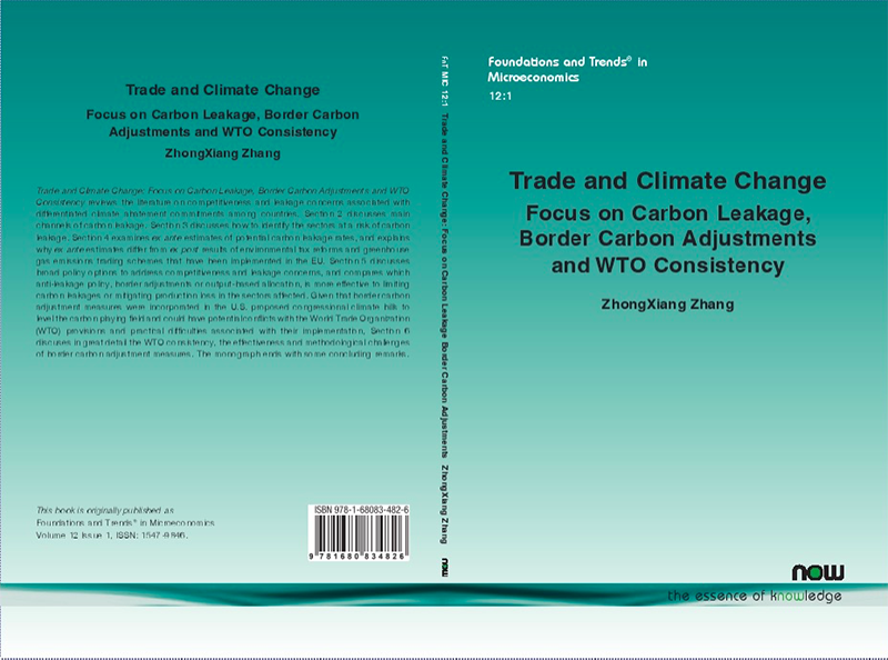 ZhongXiang Zhang (2018), Trade and Climate Change: Focus on Carbon Leakage, Border Carbon Adjustments and WTO Consistency,Foundations and Trends? in Microeconomics,Vol. 12,No. 1, pp 1-108,http://dx.doi.org/10.1561/0700000060.