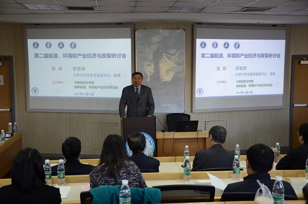 会议组织者,天津大学马寅初经济学院院长,国家能源、环境和产业经济研究院院长张中祥博士主持致辞和全天的研讨会。他首先邀请天津大学党委常务副书记、973首席科学家舒歌群教授致辞。舒教授代表天津大学向出席会议的各位发言嘉宾及参会人员表示热烈的欢迎,简要介绍了天津大学的历史和学校在能源领域主要工作和取得的成就,高度评价本次研讨会把能源、环境和产业经济纳入整体来进行研究和讨论的意义和重要性,并预祝研讨会圆满成功。