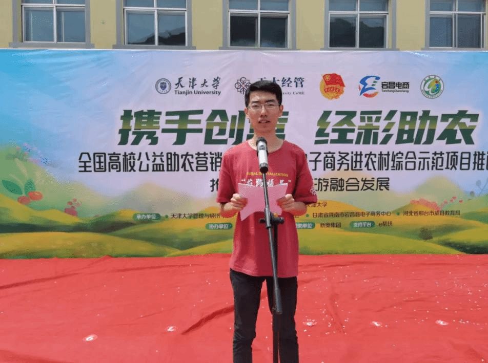 王轶涵作为实践队和营销赛参赛代表发言,他表示,“我们将带着天津大学“兴学强国”的使命和宕昌人民的期待从这里出发,创营助农,同心筑梦,为以宕昌为代表的乡村发展,为国家乡村振兴大业贡献青年力量、天大力量”。