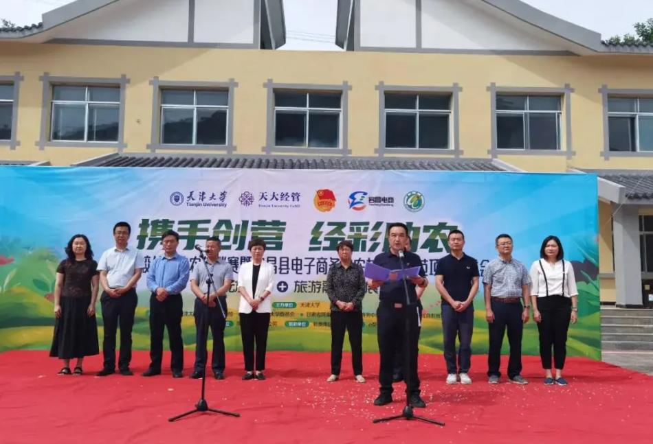 (益路援昌实践队供稿)7月27日上午,天津大学在甘肃省陇南市宕昌县官珠沟举办了“携手创营,经彩助农”全国高校公益助农营销赛开幕仪式暨云上展销会。宕昌县委常委、统战部部长、县公安局局长王碧云,县人大常委会副主任王小菊,副县长刘琳等领导;天津大学管理与经济学部市场营销系白寅、马向阳、史英杰老师,党委学生工作办公室李艺、张艺群老师;益路援昌实践队王轶涵等学生代表参加开幕仪式。仪式由天津大学挂职干部、宕昌县副县长王硕主持。
