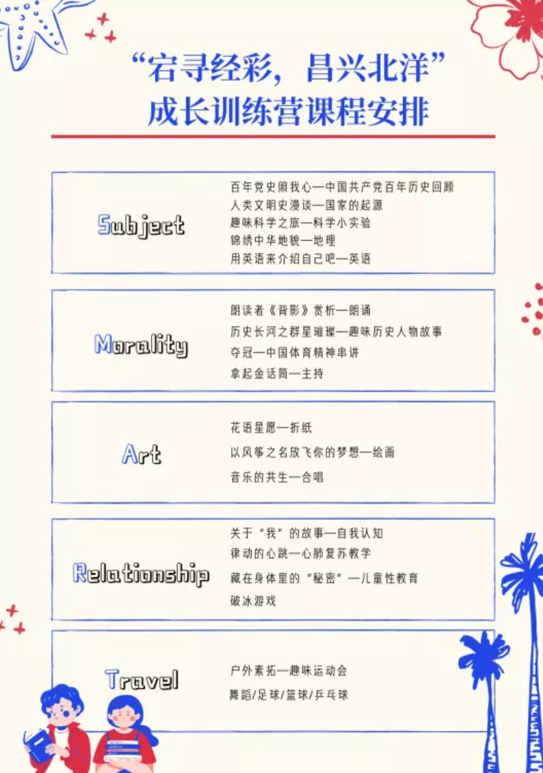 实践队以《百年党史照我心——中国共产党百年历史回顾》《用英语来介绍自己吧》等基础学科课程的开展,作为课内学习的重要补充,在知识广度和深度上下功夫,激发学生对基础学科的学习兴趣,感受学科魅力;以《夺冠——中国体育精神串讲》等德育课程的开展,向学生讲授中华优秀传统文化,传承时代精神;以《音乐共生——合唱》等艺术课程的开展,带领学生发现美、感受美,培养爱好,陶冶情操、温润心灵;以《藏在身体秘密——儿童性教育》等陪伴课程的开展,给予学生们心灵上的关怀,促进他们的身心健康发展,帮助他们做好迎接青春期的准备;以《户外素拓——趣味运动会》等户外体验课程的开展,教会学生体育技能,使学生了解团队合作的重要性,增强集体荣誉感。
