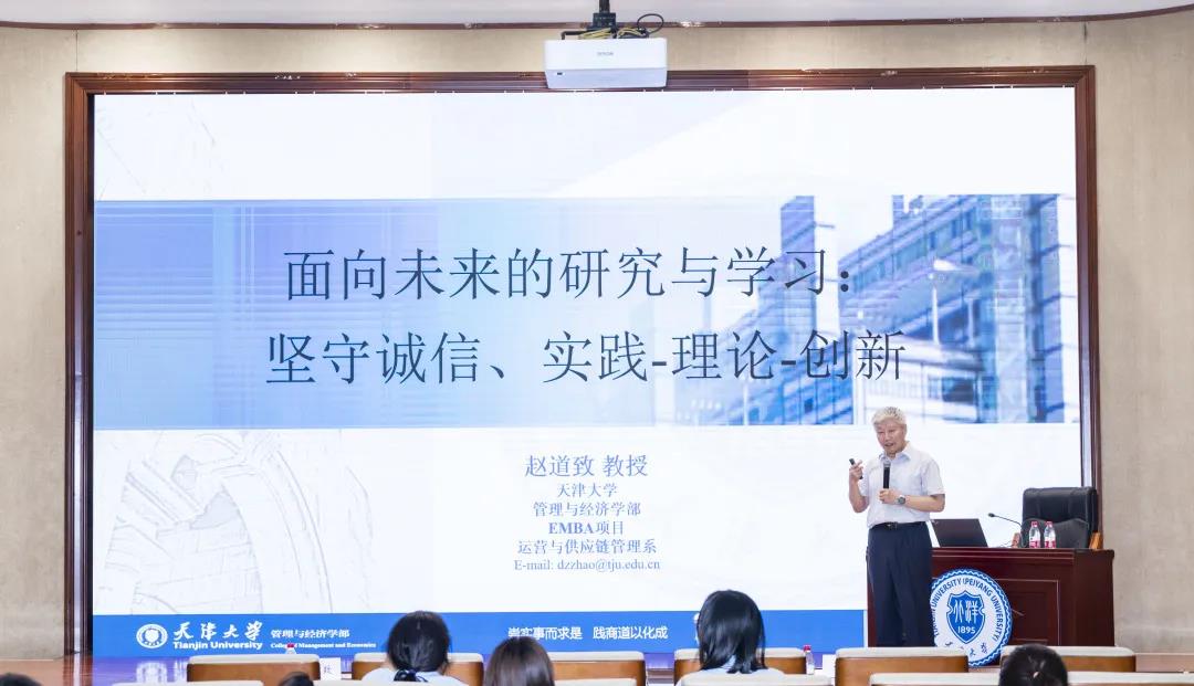 EMBA项目主任赵道致教授以“面向未来的研究与学习——实践、理论、创新”为主题,系统介绍了天津大学EMBA项目的发展历程、愿景与使命,并通过国内外及本校多起学术不端的案例,告诫大家“绝不能断送未来,坚持学术诚信”。赵道致教授针对性地结合专业学位EMBA学生的特点讲述了相关专业学位学生的学习和研究方法。