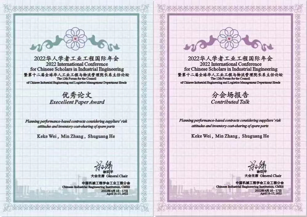 会议共设置优秀论文4篇,天津大学经管学部师生团队成果“Planningperformance-based contracts considering suppliers’ risk attitudes and inventorycost-sharing of spare parts”荣获优秀论文奖。本篇论文由学部2020级博士研究生魏可可在张敏教授和何曙光教授的指导下共同完成。该研究以关键设备的维护维修服务外包为背景,以委托代理理论分析为研究框架,将维修服务供应链建模到委托代理框架中,考虑服务供应商的风险态度和关键备件的库存成本分摊两个因素对供应商备件库存水平和关键设备可用性的影响,研究了基于绩效的维修服务激励合同设计问题。研究结果对设备运营方和服务提供方之间的协调合作机制设计具有重要管理启示。