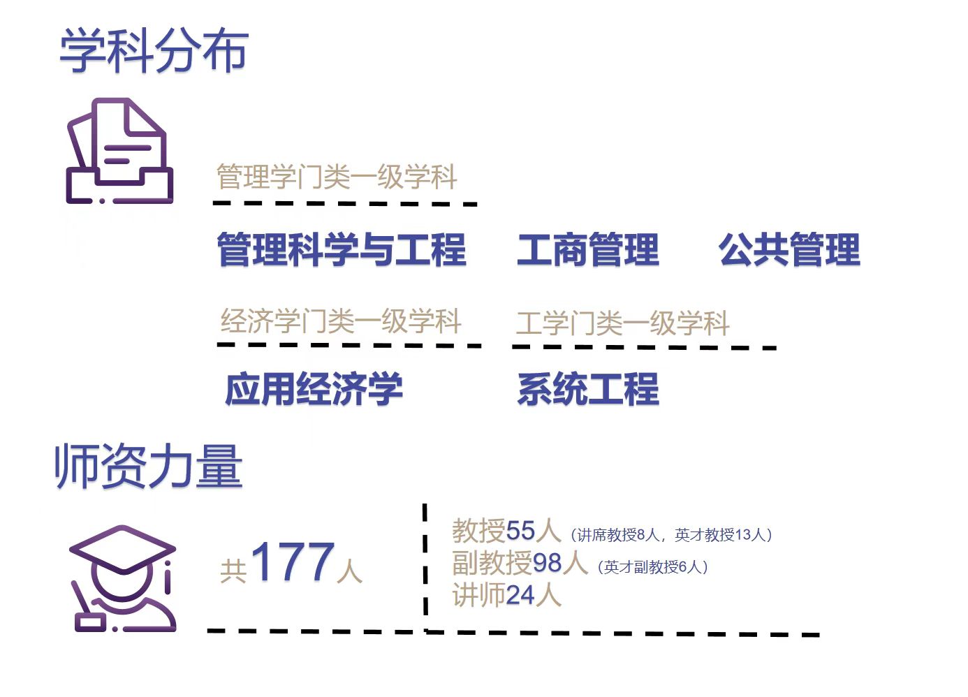 管理与经济学部学科覆盖面广,涵盖管理学门类的管理科学与工程、工商管理、公共管理三个一级学科,经济学门类的应用经济学一级学科及工科门类的系统工程二级学科等。在第四轮学科评估中,管理科学与工程学科被评为A(前3%-5%),并入选双一流学科;工商管理、公共管理被评为B+。