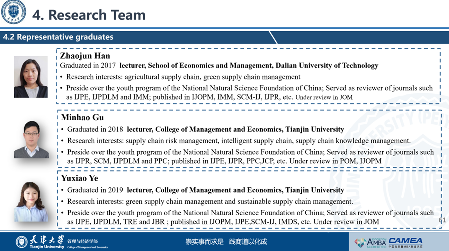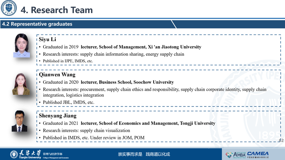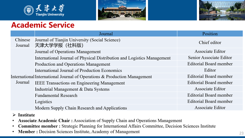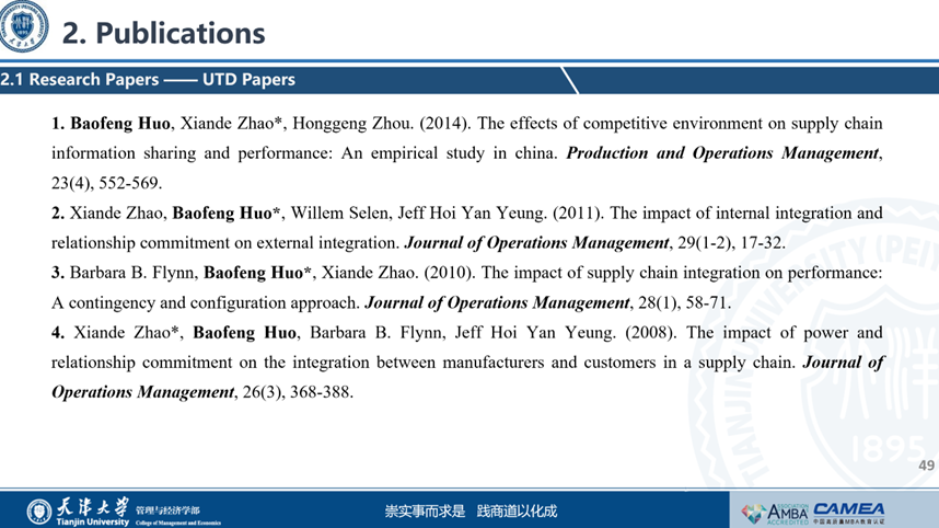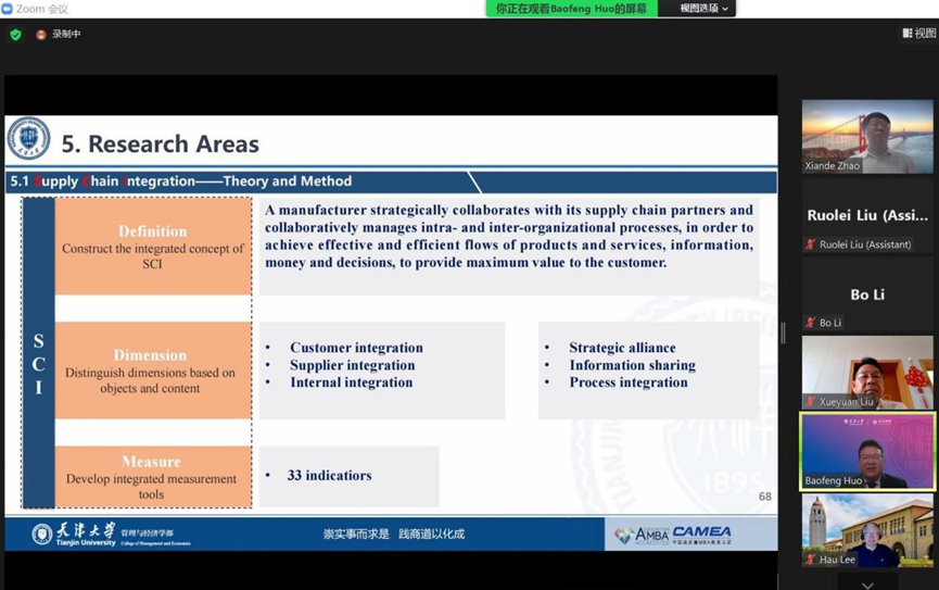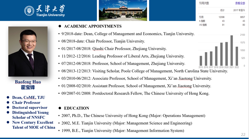 接下来,霍宝锋教授从学术服务、社会服务、论文发表、主持项目、研究团队、研究领域方面进行了介绍。截至目前,霍宝锋教授学术引用次数已高达12096次,其中2010年发表于JOM的文章Theimpact of supply chain integration on performance: A contingency and configuration approach单篇引用量已达3544次。霍宝锋教授在多个学术期刊和学会任职,主持国自科重大项目等多项研究项目、教学项目,参与多项企业咨询和培训,与天津大学管理与经济学部一起助力“新时代·新商科”平台建设,积极推进实验室建设和基地建设,打造“产学研创”生态圈。