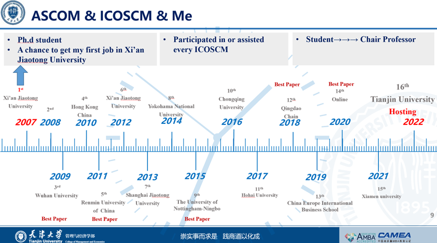 霍宝锋教授发表了获奖感言。他由衷地感谢了ASCOM、ICOSCM对他一路以来的陪伴与帮助。2007年第一届ICOSCM会议在西安举办,霍宝锋教授当时还是一名博士生,也是本次会议上霍宝锋教授与西安交通大学产生了不解之缘,之后的历届会议霍宝锋教授都参与协办或参会。转眼间,2022年的第16届ICOSCM会议由天津大学管理与经济学部主办。