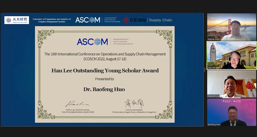 本站讯(通讯员 宇文慧)8月18日上午,国际供应链与运营管理学会(Association of Supply Chain and Operations Management, ASCOM)组织了2022第十六届运营与供应链管理国际会议(The 16 thInternational Conference on Operations and Supply Chain Management, ICOSCM 2022)的颁奖环节,霍宝锋教授获得第一届Hau Lee Outstanding Young Scholar Award。ASCOM前主席、武汉大学经济管理学院刘学元教授为获奖人颁发证书。