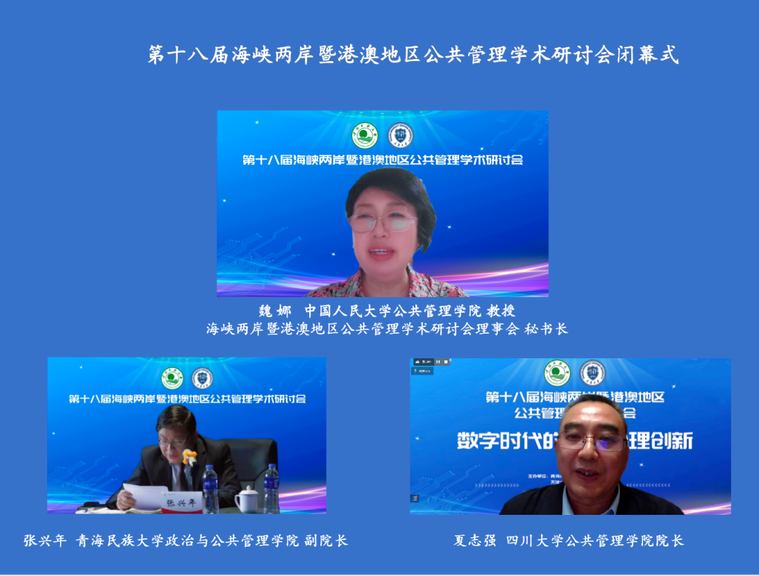 闭幕式由海峡两岸暨港澳地区公共管理学术研讨会理事会秘书长、中国人民大学公共管理学院魏娜教授主持。魏娜教授高度评价了本次大会的筹备和举办工作,诚挚感谢青海民族大学、天津大学两校会议主办方的努力及志愿者的辛勤付出。青海民族大学政治与公共管理学院副院长张兴年教授对会议进行总结,回顾了此次会议的筹备过程与会议研讨交流情况,再次感谢海峡两岸暨港澳地区公共管理学界同仁们的关注与热情参与。四川大学公共管理学院院长夏志强教授代表第十九届会议主办方发言,会议在举办权交接活动中圆满落幕。