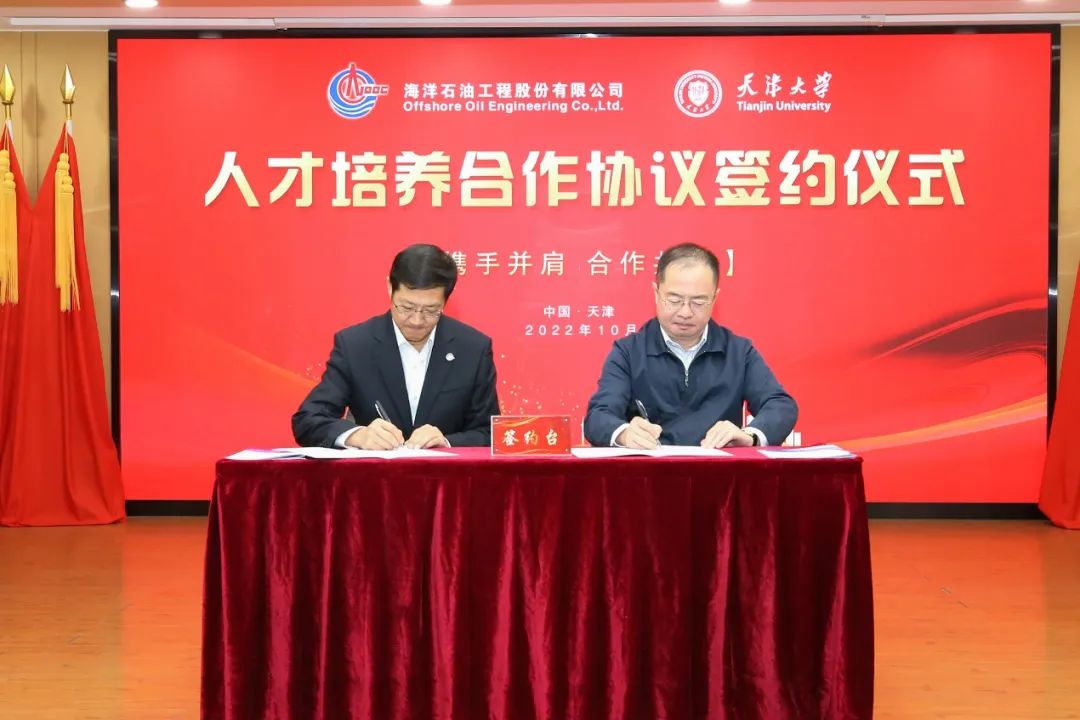 (本站讯 通讯员:于晨)10月19日,天津海洋装备产业(人才)联盟暨海油工程人才工作会在滨海新区成功举办。天津大学副校级干部谭欣应邀出席本次会议,管理与经济学部党委书记马寿峰、副主任毛照昉陪同。会上,天津大学副校级干部谭欣,海油工程董事长、党委书记于毅分别代表天津大学与海洋石油工程股份有限公司签署人才培养合作协议。签约仪式由海油工程总裁、党委副书记王章领主持。