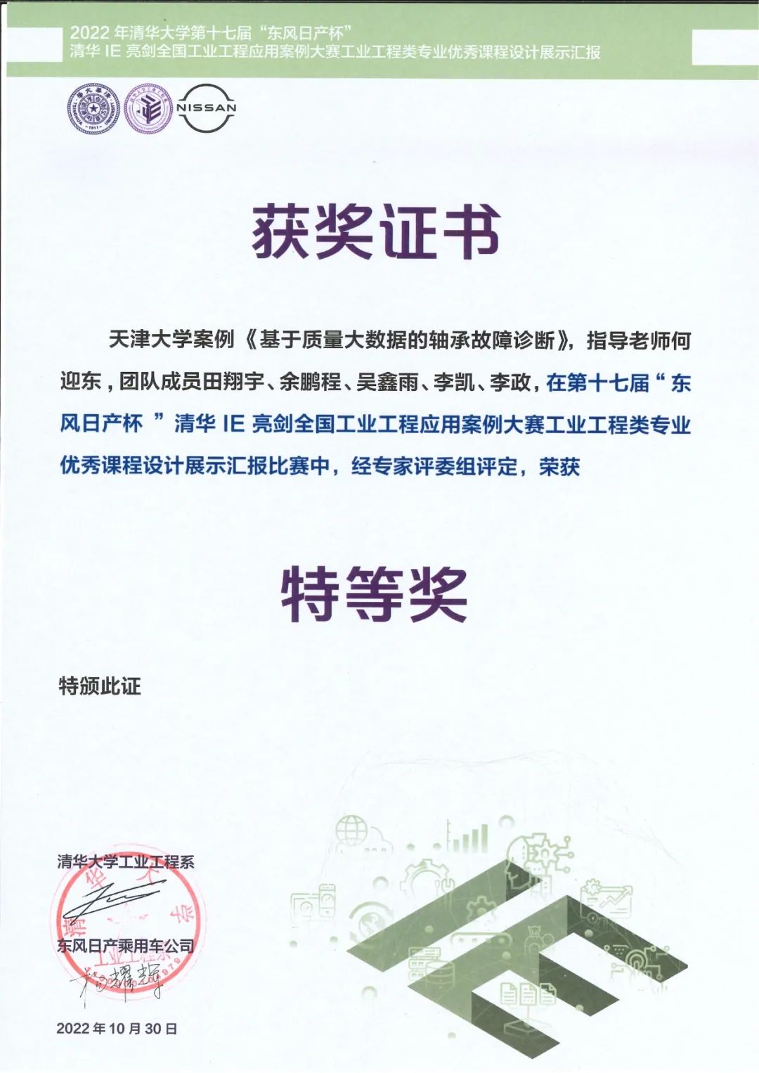 由工业工程系何迎东副研究员指导的北洋小伙伴队的参赛作品“基于质量大数据的轴承故障诊断”,以赛题第一名成绩,获决赛全国特等奖。团队成员是工业工程专业田翔宇、吴鑫雨、李凯、李政,信息管理与信息系统专业余鹏程。