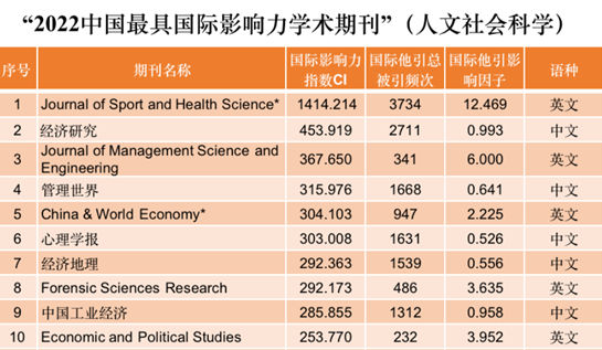 本站讯(通讯员:冯绪 谷叶馨)12月5日, 2022 年“中国最具国际影响力学术期刊”(TOP 5%)发布,经管学部承办期刊Journal of Management Science and Engineering(JMSE)连续两年入选该榜单,并荣获2022 “中国最具国际影响力学术期刊(人文社会科学)”第3名,同时也是该榜单前10名中最年轻的期刊。