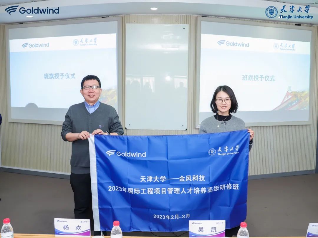 伴随着雄浑高雅的天津大学校歌,出席开班的各位领导为学员代表佩戴校徽,管理与经济学部党委副书记袁婷将培训班班旗授予金风国际首席财务官朱辉。