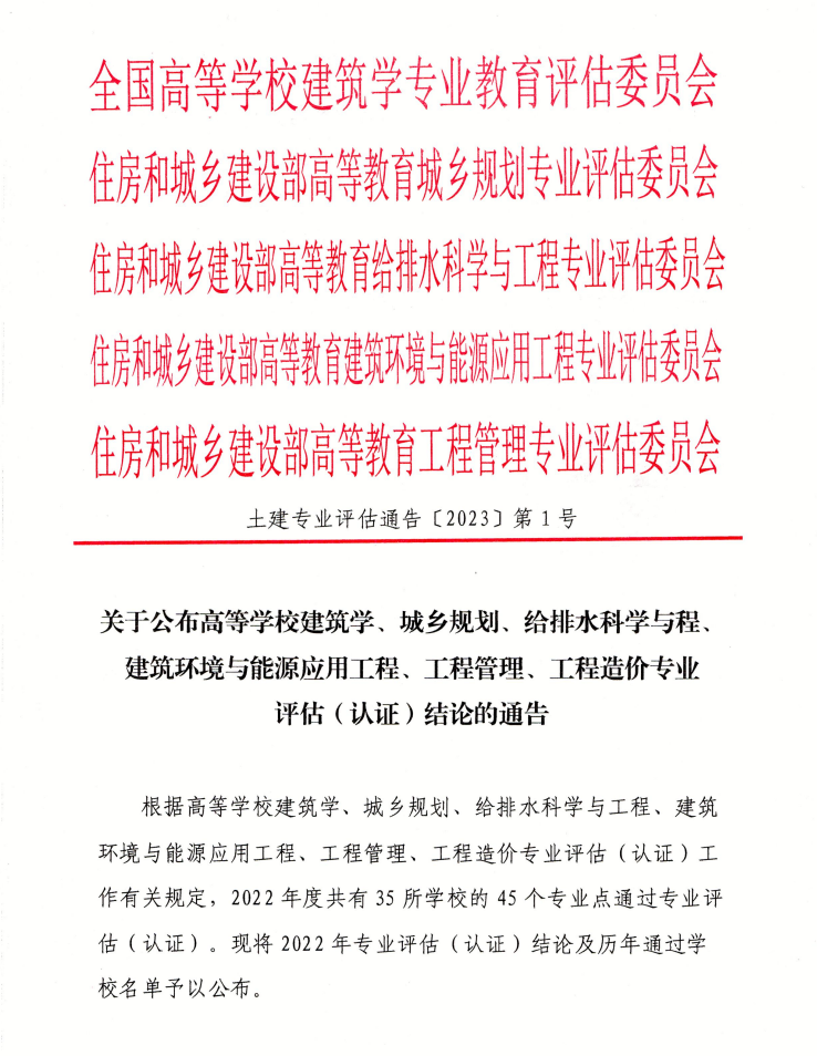住房和城乡建设部发布的《关于公布高等学校建筑学、城乡规划、给排水科学与工程、建筑环境与能源应用工程、工程管理、工程造价专业评估(认证)结论的通告》(土建专业评估通告〔2023〕第1号)显示,2022年共有35所学校的45个专业点通过专业评估(认证)。天津大学工程管理专业于2001年首次通过专业评估,本次为第四次通过住建部专业评估(认证)复评,合格有效期为6年(2022.5-2028.5)。