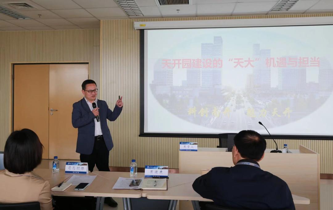 南开区科技局局长、党组书记肖述虎首先带来题为“天开园建设中的’天大’机遇与担当”的分享。肖局长以天开园的地理位置、天开园的使命任务、天开园的建设规划等若干焦点问题揭开了天开园建设的神秘面纱,介绍了天开园的总体布局、发展目标、模式与政策,并介绍了我校在天开园建设中担当的角色、参与的项目、以及未来的机遇。