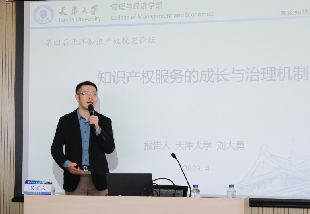 天津大学管理与经济学部主任助理、公共管理学院副院长、研究基地副主任刘大勇最后带来关于“知识产权服务的成长与治理机制”的主题报告。刘老师介绍了知识产权公共服务与市场化服务协调发展的思路,从数字信息机制、要素融合机制、企业竞争机制等视角阐述了知识产权服务对经济发展动能的作用,分别指出“基础支撑型”“发展推动型”“要素配置型”知识产权服务在不同阶段巩固市场基础、完善市场环境和催化市场运转方面的作用机理,由此建立因势利导、因地制宜、动态协调的知识产权治理机制。