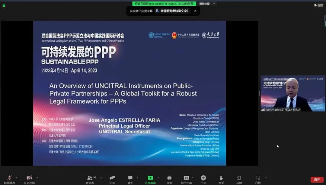 本站讯(天津大学供稿)4月14日,联合国贸法会PPP(政府和社会资本合作)示范立法与中国实践国际研讨会在天津大学以“线上+线下”的形式隆重召开,1400余名国内外专家学者、业界代表和青年学生参会。与会嘉宾聚焦联合国PPP立法实践与法律框架、PPP治理与合同、PPP价值共创等议题,共同探讨了PPP实践中的立法与可持续发展问题。此次研讨会由中华人民共和国商务部、联合国国际贸易法委员会联合主办;天津大学管理与经济学部、天津大学法学院联合承办;天津大学国际工程管理学院、天津大学高层次国际化人才培养创新实践基地协办,得到国家自然科学基金重点项目(72031008)的研究支持。