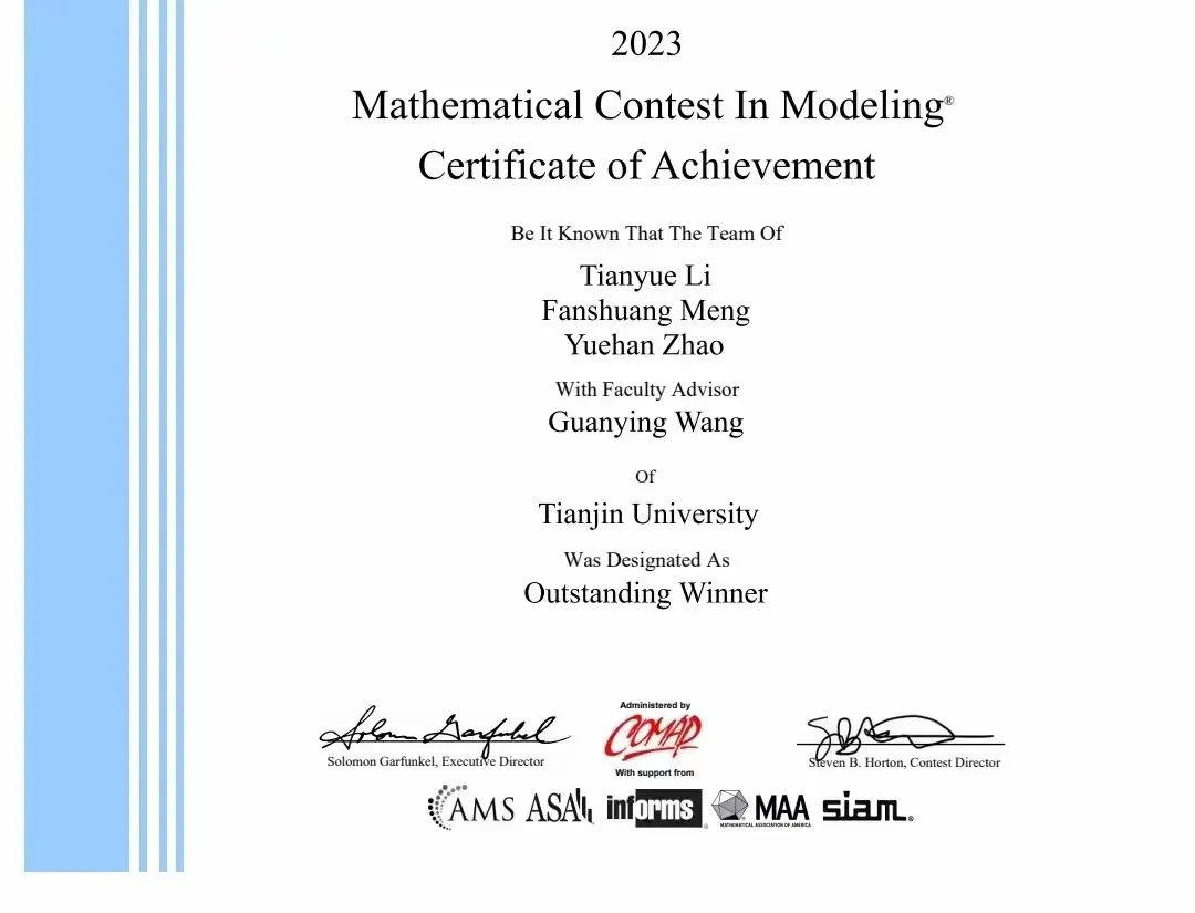 本站讯(通讯员:王冠英)5月9日,2023年美国大学生数学建模竞赛(MCM/ICM)成绩正式公布,在天津大学管理与经济学部王冠英副教授的指导下,2020级本科生信息管理与信息系统专业李天月、赵悦涵与金融学专业孟凡双取得特等奖(Outstanding Winner)的最高荣誉(前0.15%)。