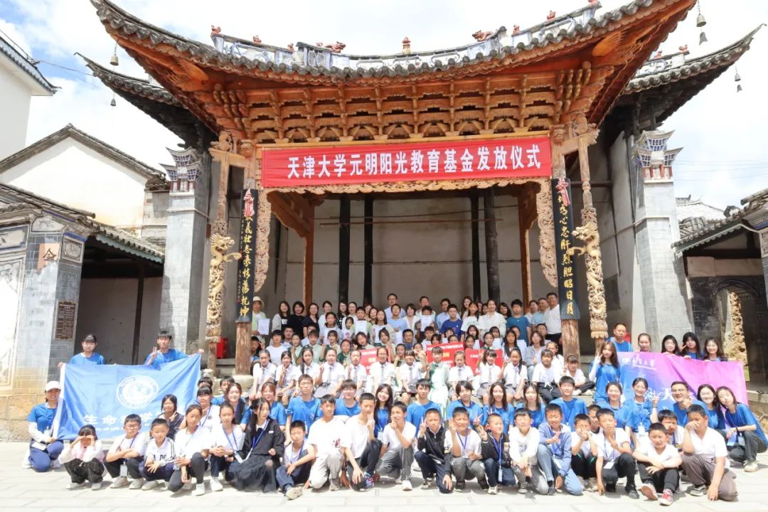 天津大学元明阳光教育基金发起人、天津大学管理与经济学部EMBA校友童元明,天津大学校团委书记管虹,天津大学管理与经济学部教授施亮星,洱源县凤羽镇党委书记李伟钢,洱源县凤羽镇党委副书记、镇长王国亮,天津大学未来技术学院副院长、宣怀学院常务副院长于倩,天津大学生命科学学院党委副书记尚洁分别为在教学中作出突出贡献以及在学习中取得优异成绩的凤羽当地老师和同学们颁奖。