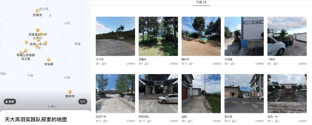 与此同时,实践队赛布丁江·艾则孜老师带领两位队员走遍凤羽镇,将包括凤翔书院、白石江桥、帝释山古寺建筑群等26个著名文化性地标与古建筑录入高德地图,并对其中10处古建筑进行全景制作,实现线上360度全景游览,便于游客及当地村民查询、了解、参观,让更多人来到凤羽、感受凤羽、爱上凤羽。