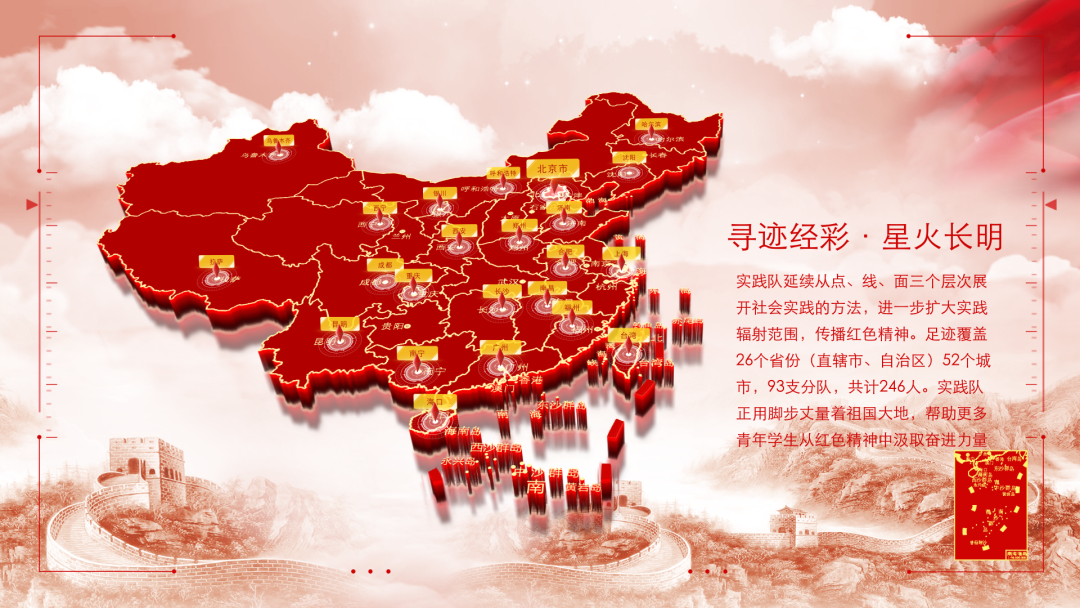青年有着年轻的担当,青春的活力和忠诚的信仰。“寻迹经彩·星火长明”实践队以主实践队与分实践队相辅相成的方式,坚持以一带多、点线面结合的特点,重走长征路、寻迹总书记足迹、追忆中国共产党人的精神谱系的形成和发展过程。两年时间里,他们的足迹遍布祖国21个省、4个自治区、4个直辖市。哪里有过红军艰苦奋斗的身影,哪里就有他们追忆红色故事,传承红色血脉,践行红色精神的身影。他们带动近500名青年学生参与到社会实践当中,深入100多个城市,200余红色圣地。在实践过程中,他们调研走访,赋能红色文旅产业新发展;他们脚踏实地,探索党团思政教育新格局;他们追寻记忆,传承红色精神谱系新篇章。
