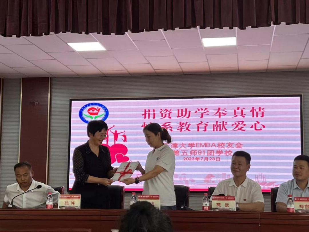 7月23日,EMBA校友代表来到了新疆生产建设兵团第五师九十一团学校(以下简称“九十一团”),为40位品学兼优的同学和6位优秀教师,每位捐赠2000元助学金/支教金,总计9.2万元。一笔笔捐助,蕴含着天大EMBA校友和老师们无限真诚的祝愿,希望助力边疆学子实现求学梦想,感恩教师们的无私奉献。