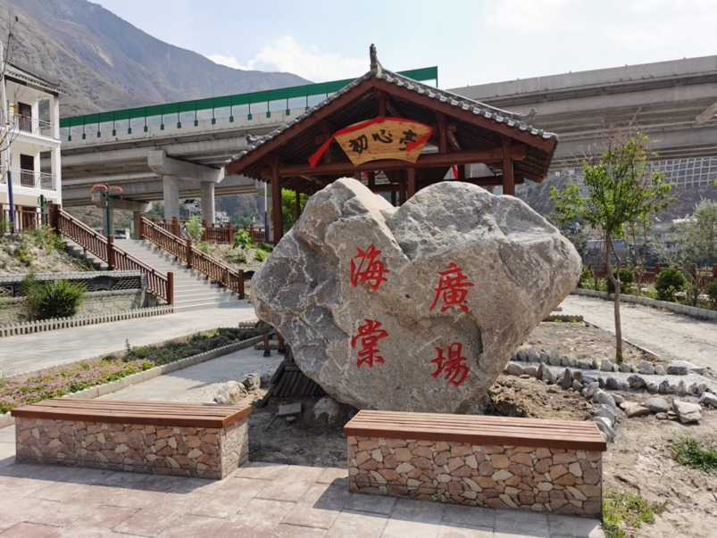 海棠广场占地3300平方米,其名称来源于广场道路两边种植的海棠树和油橄榄树。海棠是天津大学的校花,油橄榄是沙湾镇种植的特色经济作物,寓意两地心手相连、携手前行。广场上立着一块刻有“海棠广场”四个大字的心形石和一块雕刻了《海棠广场记》的石碑。心形石寓意天大的爱心,《海棠广场记》介绍了天大对大寨村的帮扶历史和大寨村的脱贫攻坚之路。广场上还建有一个“初心亭”,亭子里装有古老石磨,既寓意子孙后代要不忘初心,勤俭持家,又寓意我们党不忘初心,为民众谋幸福。供水站建起来了,路灯也有了,这一切都在让大寨村悄悄地换了新颜。