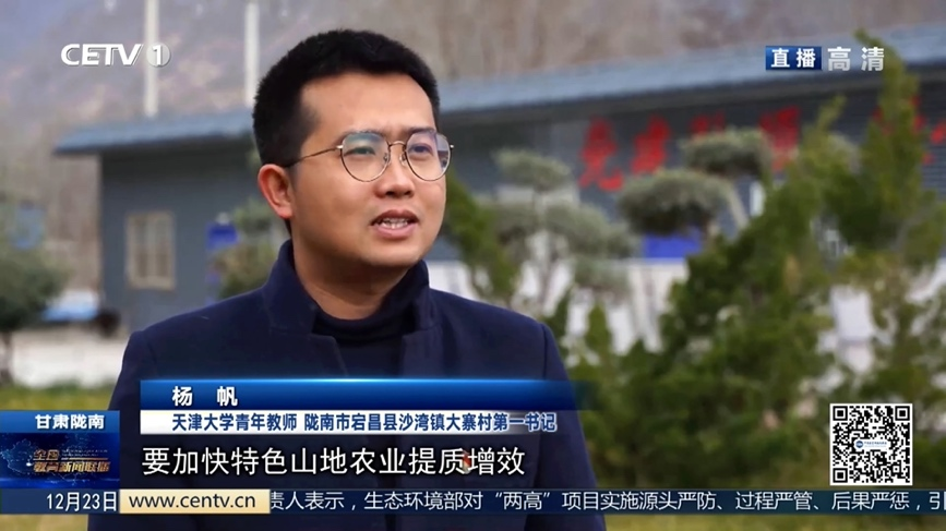 甘肃省宕昌县地处青藏高原边缘,山大沟深,自然条件艰苦,位于该县南部的大寨村,曾是个“无人、无地、无资源”的贫困村。2013年起,学校先后派出三位驻村第一书记,他们扎根大寨村接续奋斗,用热血挥洒青春,来自经管学部的杨帆就是接棒的第三任第一书记。