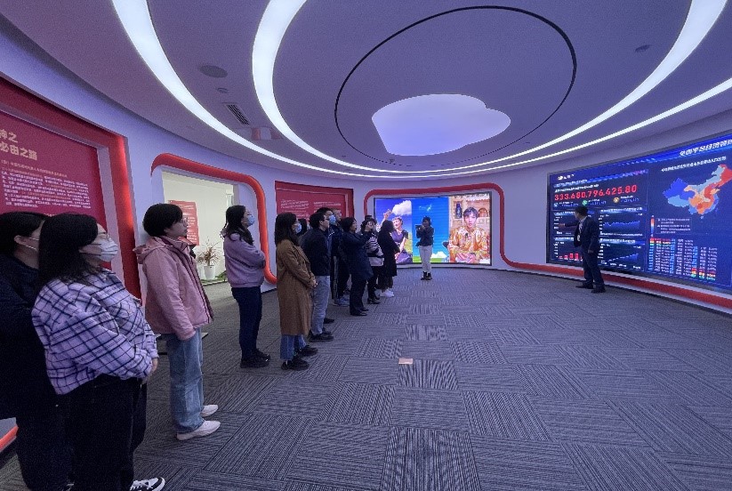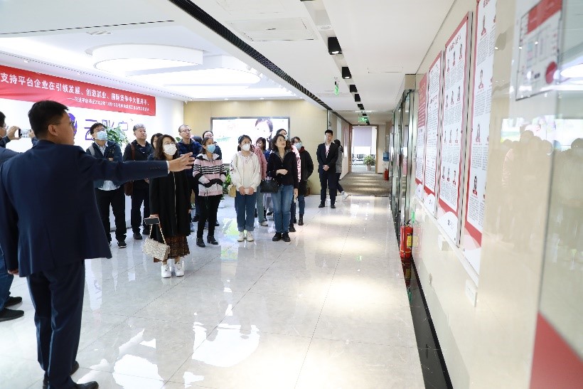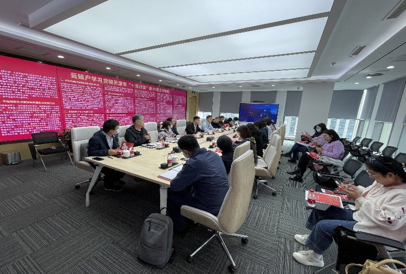 云账户(天津)共享经济信息咨询有限公司公共事务部专家分析师王春亨为老师们介绍了公司的业务开展情况和风控体系建设情况,带领老师们参观了公司的数字展厅、荣誉墙、办公室,介绍了公司“四快一慢”等提升工作效率的方式方法等。参观环节后,双方在会议室中进行了深入的座谈交流,进一步了解公司的党建引领实施情况,并就今后双方在学生实践、教育合作等方面进行了研讨。