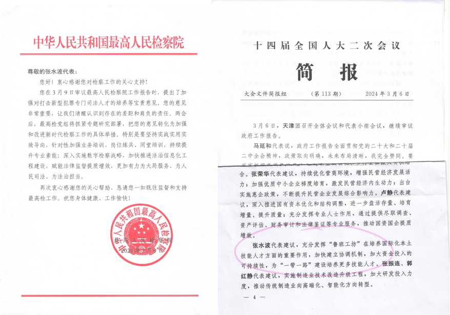 此次大会,天津团参加了两会的所有审议工作,提出了4项议案、80件建议,重点关注四个“善作善成”、三新三量、服务“十项行动”,并积极参与媒体宣传,做好天津高质量发展宣传员。张水波围绕“关于加强鲁班工坊师资培养力度,更好服务一带一路高质量发展”“关于制定我国建筑业付款保障与审裁法”“关于完善住房租赁行业信用评价体系,促进房屋租赁市场健康发展”“关于加快完善市场机制,深化全国统一电力市场体系建设”提出了四方面建议。