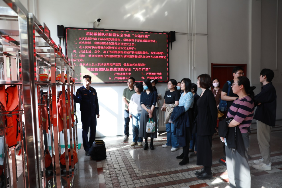 在消防站郭绍博指导员的带领下,教师党员们参观了消防站各项设施。历史墙前,了解五马路消防站的发展历程;宿舍内,感受消防员的日常生活环境;荣誉室内,见证消防站集体及个人的荣誉成就和群众的感谢锦旗;训练基地中,观摩消防车、消防服和日常训练。